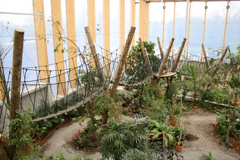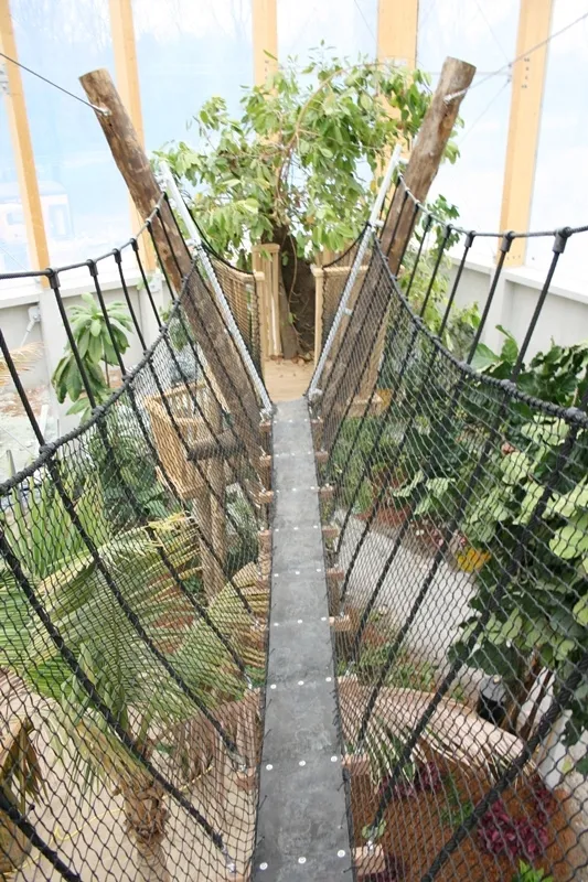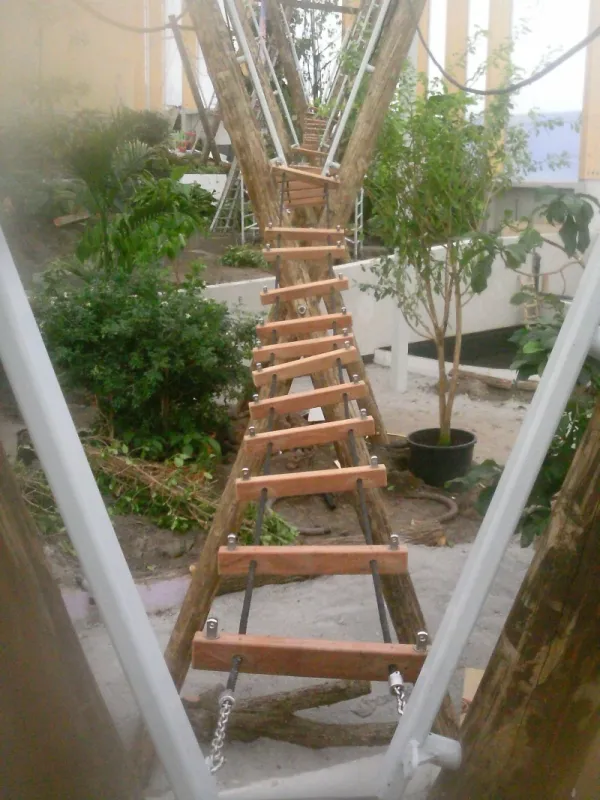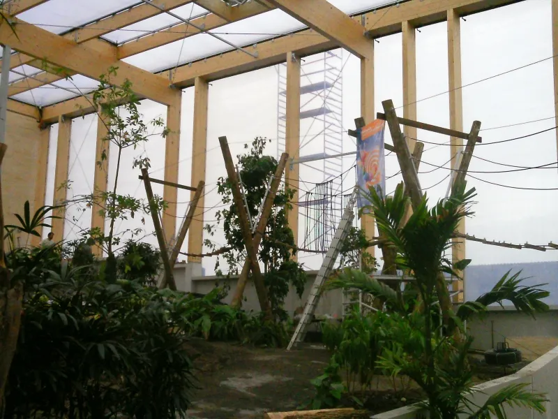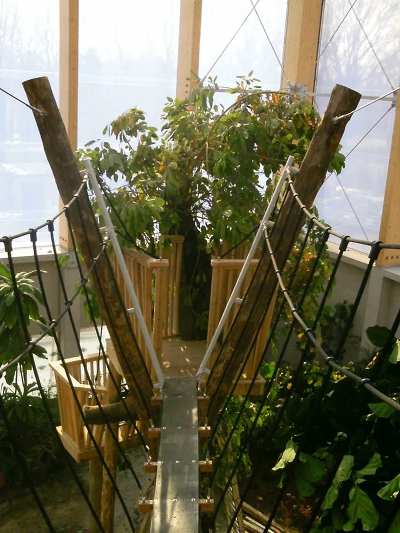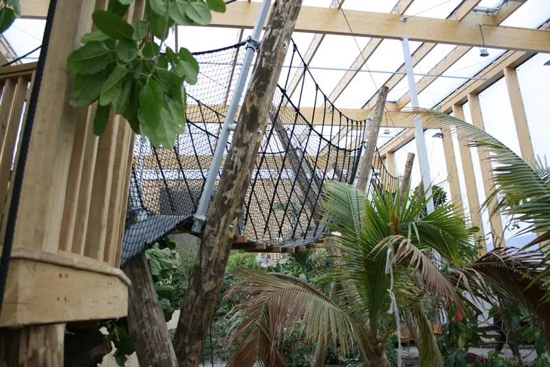 De staanders van de Canopy zijn gemaakt van cloeziana, wat zeer goed past de uitstraling van deze tropische tuin en is het prima bestand tegen dat warme en vochtige klimaat. Om de luchtbrug te bereiken, moeten de bezoekers eerst via een laddertje naar een vijf meter hoog gelegen eiken platform, dat steunt op de tropische boom. Vandaar lopen ze over een pad van rubber ondersteund door cumaru balkjes en omzoomd met veiligheidsnetten. Onderweg naar het restaurant doorkruisen ze nog een tussenplatform, eveneens gemaakt van eiken.