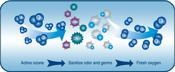Ozongas is 50 keer krachtiger en werkt 3000 keer sneller dan chloor. Ozon (O3) breekt van nature af tot zuurstof. Met de juiste concentratie en blootstellingsduur, worden alle soorten bacteriën, virussen, schimmels, schimmels en slechte geuren geëlimineerd. Deze sanitatiemethode zorgt voor een optimale hygiene van de materialen (PBM).